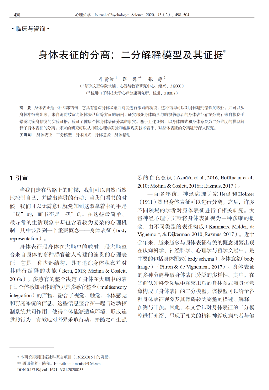 本文系统阐述了身体表征是一种内部结构,它具有追踪身体状态并对其进行编码的功能。这种结构可以对身体进行错误的表征,并可以从身体中分离出来。来自海豹肢症与躯体失认症等方面的病例,证实部分身体畸形与脑损伤患者的身体表征存在分离;来自橡胶手错觉与全身错觉的实验证据,验证了健康个体身体表征分离的事实。基于上述证据,文章以身体图式和身体意象为二分维度的模型解释了身体表征的分离。在此基础上指出,未来的研究可以从神经心理学实验和虚拟现实技术着手,对身体表征的分离进行深入探究。