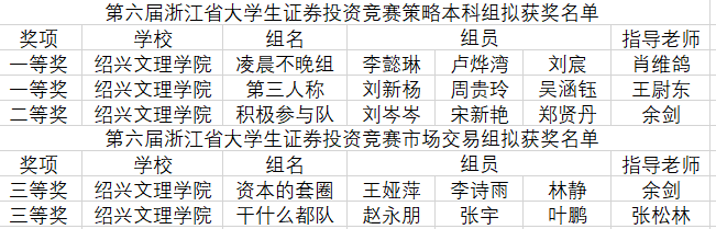 11月21日,由浙江省教育厅、浙江省大学生科技竞赛委员会主办的浙江省第六届“浙商证券同花顺杯”大学生证券投资竞赛决赛在浙江理工大学举行,决赛答辩采用线上形式(钉钉平台)进行。我校共获得了一等奖2组,二等奖1组,三等奖2组。