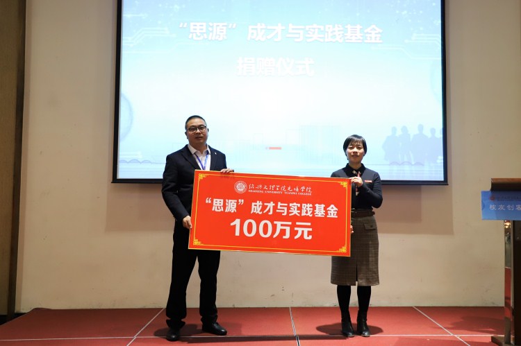 学院“思源”大学生成才与实践基金捐赠仪式,云联盟第一届理事会会长潘自成(图左)代表云联盟向学院捐赠100万元“思源”成才与实践基金