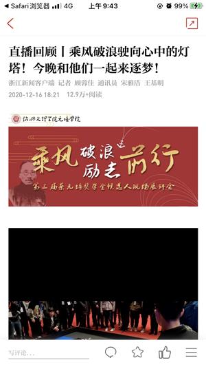 当晚,浙江新闻客户端对本场评选活动进行了全程现场直播,吸引了广大师生的在线积极交流与互动,截止目前,点击量已近13万。