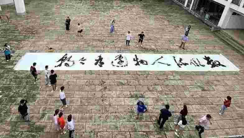 6月17日,兰亭书法艺术学院兰亭序照壁前,“数风流人物还看今朝”9个2米见方的擘窠草书呈现在巨幅白练之上。作品创作者、教育部全国普通高校中华优秀传统文化传承基地(书法)主任、兰亭书法艺术学院教授沈伟表示,旨在通过气势雄健的书法作品表达学院、学校、书法圣地绍兴对中国共产党建党百年的深情祝福。 当日恰逢学校2021届学生毕业典礼,沈伟老师的这幅作品不仅表达了学院师生庆祝中国共产党建党百年之拳拳深情,也饱含着对毕业生们的殷殷祝福。