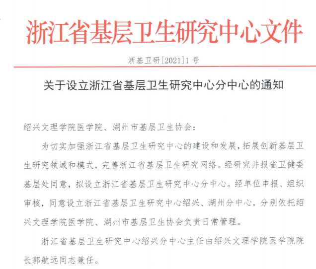 近日,浙江省基层卫生研究中心下发通知,设立浙江省基层卫生研究中心绍兴分中心和湖州分中心,绍兴分中心依托于我校医学院进行日常管理,中心主任由校党委委员、医学院院长郭航远教授兼任。