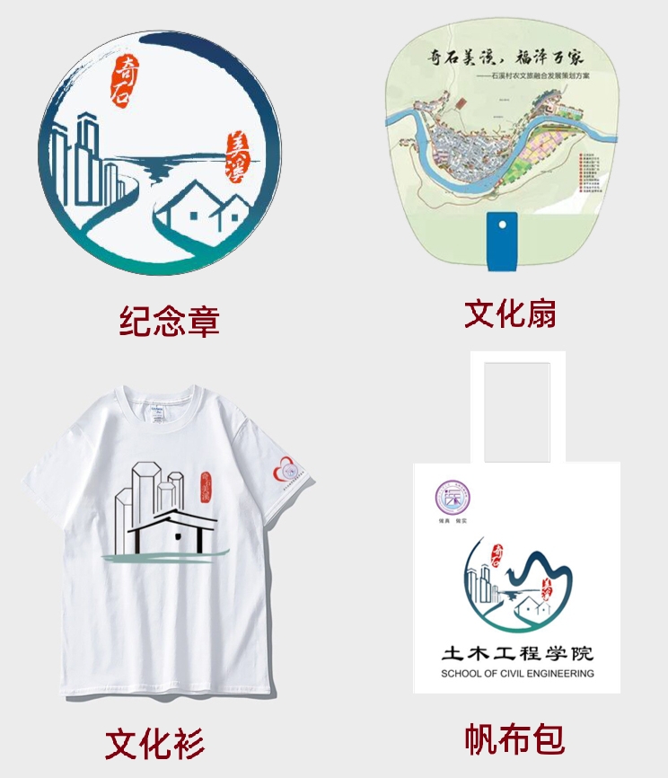 调研前,团队成员吸收该村玄武岩特色地貌、十八都江等风景元素,制作了定制文化衫、帆布袋、徽章、文化扇等系列文创产品,并在调研期间发放给村民,受到村民的喜爱。调研期间,成员们还制作发放了关于地质灾害防灾减灾、村嫂志愿服务文化、村庄治理乡村建设等近200份调查问卷、宣传手册。通过采访村嫂代表,进一步了解村嫂文化内涵,并和村嫂一起设计开展志愿服务,把“有事情找村嫂”这句口头禅转化为乡村志愿服务的新动力。