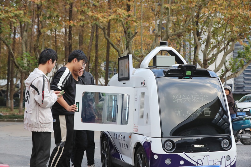 只见一辆无人驾驶的白色小车在校园内穿梭,学生可招手叫停小车,通过扫码自助购买车内的饮料,引来不少学生好奇尝鲜。这是绍兴城投智慧公司和百度公司合作开发的首批无人驾驶智慧零售车,由机械与电气工程学院负责校园演示保障。