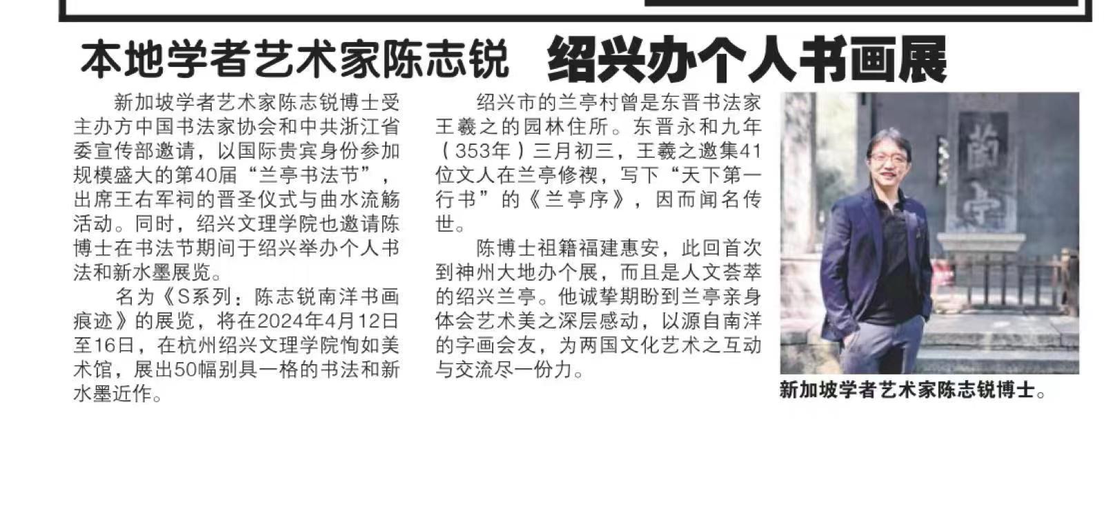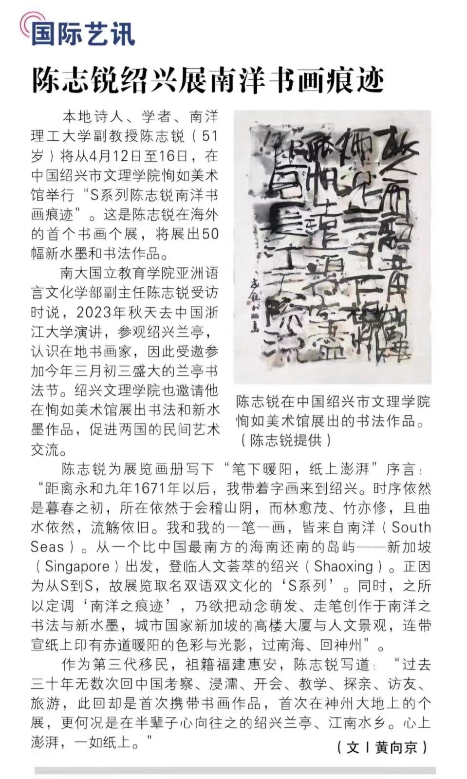 新加坡《联合早报》《新明日报》报道我校“S系列陈志锐老师南洋书画痕迹展”活动。