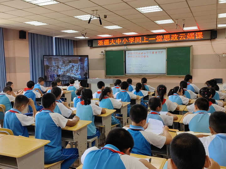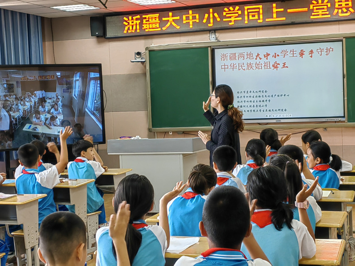 “同学们,让我们和远在新疆的小伙伴们打招呼,问声好!……” 随着浙江中学生与新疆小学生及援疆教师的热情挥手与高声欢呼,2024年6月5日,在柯桥区非物质文化遗产保护中心、绍兴市虞舜文化研究会的指导下,绍兴文理学院大学生吴越文化研究会的大学生携手柯桥区王坛镇中学、新疆阿瓦提鲁迅小学,共同开展了一场“大手拉小手,浙疆两地大中小学生跨时空守护中华民族始祖舜王”的主题思政课。