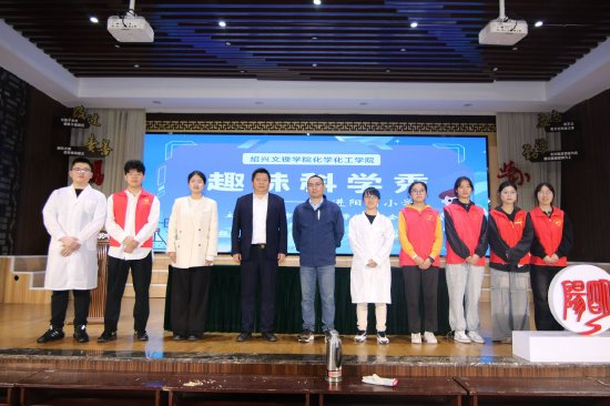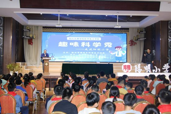 巨大的量筒内不同颜色的水剧烈翻滚着,白色的烟雾不停的冒出,水的颜色也随之发生着变化。11月1日,绍兴文理学院化学与新材料科普基地的科普团队前往绍兴市阳明小学开展趣味科学秀,为小学生打造了一场充满奇幻与惊喜的科学实验秀。