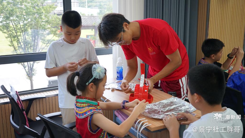 山中出凤凰,凤凰出“山哈”。在浙南的青山绿水间的畲乡景宁,志愿者精心设计并围绕“畲族传统服饰”准备了一系列特色课程。作为畲族传统服饰重要组成部分的“凤凰装”是其中不可忽视的一部分,对此,志愿者带领孩子们通过开展手工课程制作属于自己的“凤冠”。在志愿者的带领下,孩子们充分发挥动手能力与创造能力,裁剪瓦楞纸并将其环成圆圈状,利用红色胶带进行固定,在底座基本成型后,通过剪切、折叠、揉搓等多种方式将锡纸粘贴到底座上,最后只要再按照自己的喜好将宝石贴纸装饰到“凤冠”上,一盏独一无二的“凤冠”便诞生了。在动手的过程,不但培养了孩子们的实践能力,还进一步加深了其对畲族传统服饰的认识。