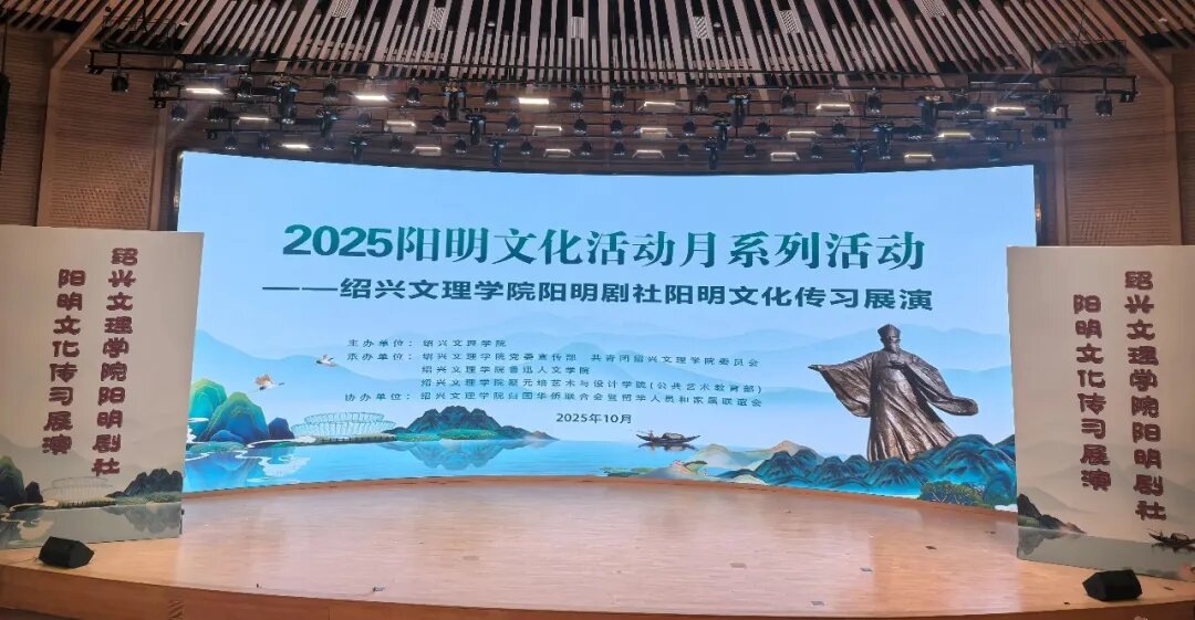 2025年10月30日晚,作为2025阳明文化活动月系列活动之一的绍兴文理学院阳明剧社阳明文化传习展演在绍兴文理学院风则江大讲堂精彩上演。来自全国各地参加阳明心学大会的专家学者、第六届全国大学生阳明文化传习研讨营的青年学子,以及绍兴文理学院师生600余人共同观赏了这场融学术性、艺术性与思想性于一体的文化盛宴。
