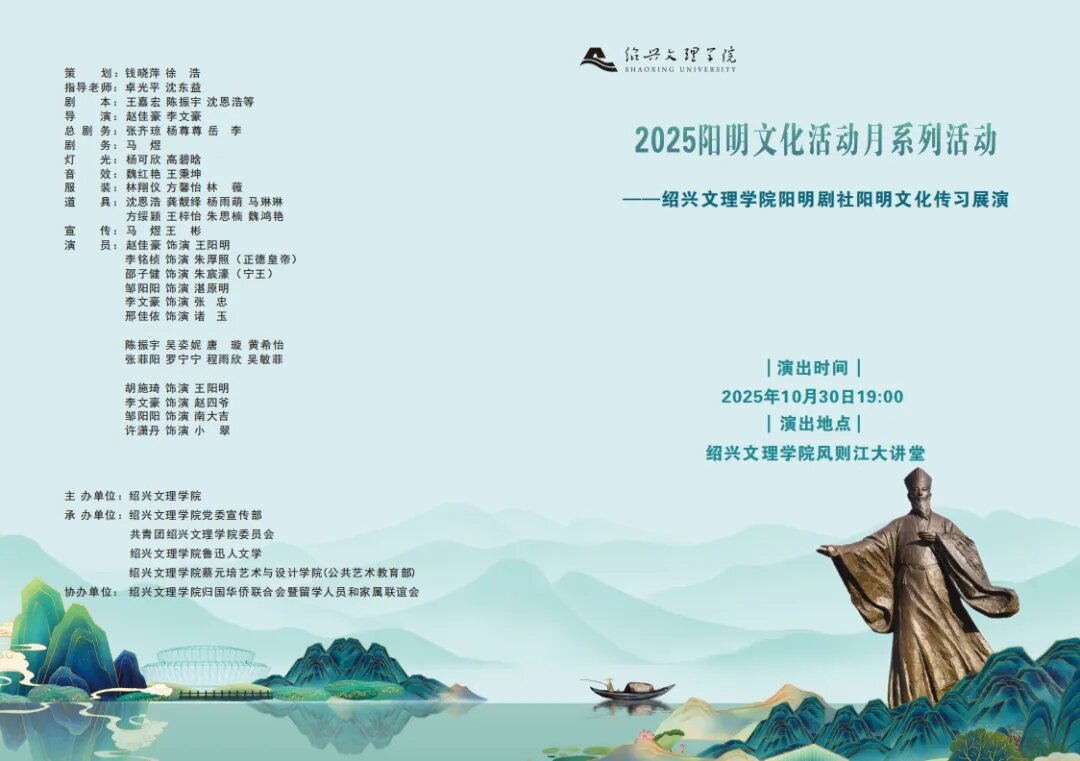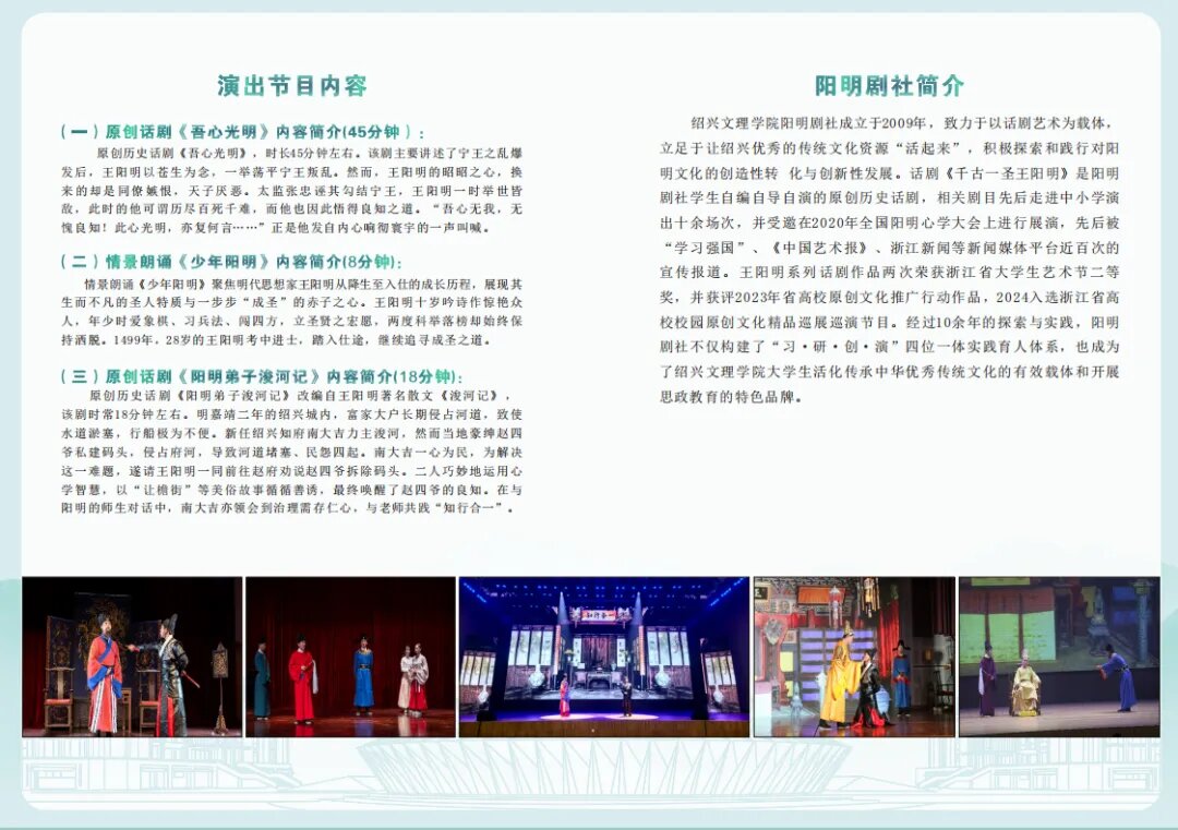 据悉,绍兴文理学院阳明剧社自2009年成立以来,始终致力于以话剧艺术为载体,深耕绍兴丰厚的历史文化土壤,积极探索对以阳明文化为代表的优秀传统文化进行创造性转化和创新性发展。剧社学生自编自导自演的《千古一圣王阳明》《吾心光明》等系列原创历史话剧,已成为校园文化品牌。相关剧目不仅多次走进中小学,累计演出十余场,更曾受邀在2020年全国阳明心学大会上展演,并得到《中国艺术报》、浙江新闻、学习强国等主流媒体平台的广泛报道,影响力深远。