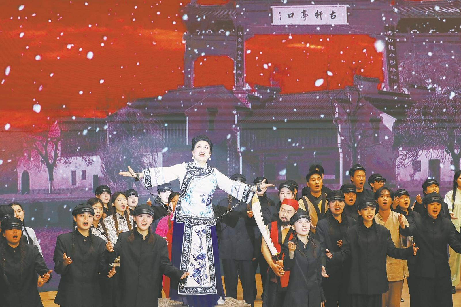 11月8日,恰逢秋瑾诞辰150周年,歌剧《秋瑾》在绍兴文理学院风则江大讲堂上演。作为首部以歌剧形式演绎绍兴历史名人的舞台艺术作品,该剧立足史实,讲述了秋瑾挣脱封建桎梏、自费东渡日本求学、投身救国救民事业的壮阔人生。剧目运用现代舞美技术,以跨时空叙事勾勒出悲壮感人的历史场景,歌词巧妙融入中国经典诗词与名人名句,将秋瑾、徐锡麟、陶成章、鲁迅、蔡元培等参与辛亥革命的绍兴志士群像贯穿始终,生动再现了近代志士的家国情怀。(孙和晴 文 周晶 摄)