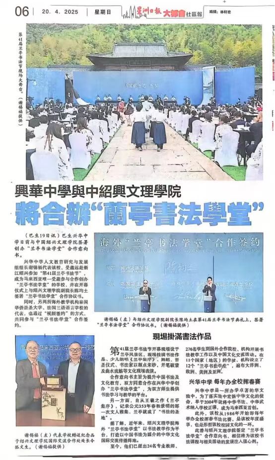 马来西亚《星洲日报》4月20日:《兴华中学与中国绍兴文理学院将联合举办“兰亭书法学堂”》