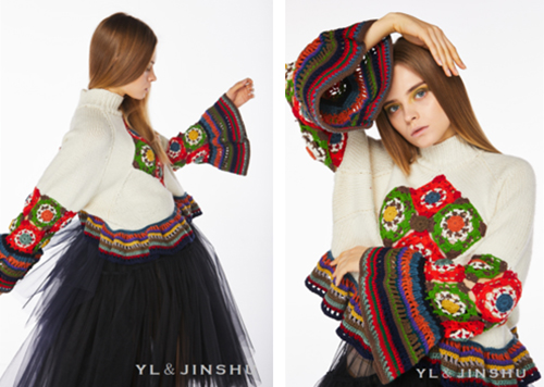 传统民族服饰往往结构宽松、自由包裹,这一特性被YL&JINSHU延展为秋冬针织服的核心版型:如超大肩线斗篷、下摆不规则的钩编拼接等,通过“流动”取代“束缚”,展现女性柔韧而有力的身形。