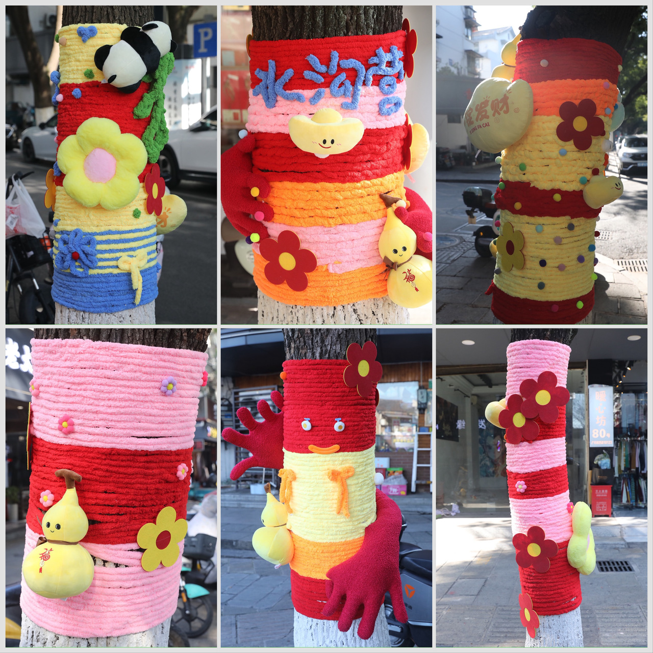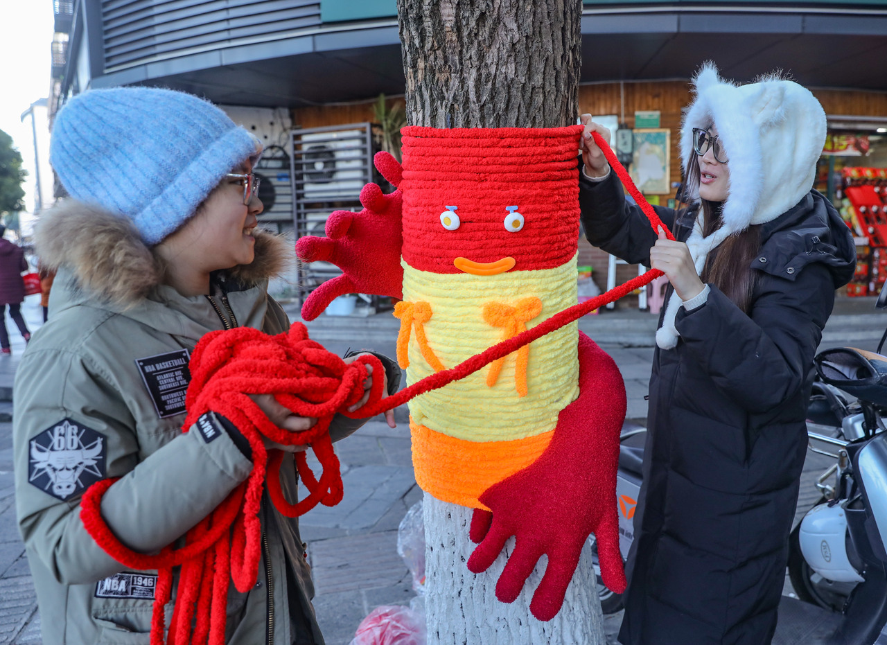 活动现场暖意融融,志愿者们以小组为单位,在社区干部的带队下各司其职、分工协作。大家紧扣党建引领核心,搭配红花、福气葫芦、元宝等新年符号,更巧妙结合美食街特色,点缀可爱的造型+装饰。缠丝带时的细致勾勒、挂装饰时的反复调整、调造型时的默契配合,指尖翻飞间,一棵棵树木渐渐披上色彩斑斓的“冬日盛装”,错落有致的装饰与沿街商铺的烟火气相映成趣,吸引不少居民、商户驻足观赏、拍照打卡,成为美食街上一道兼具颜值与内涵的风景线。