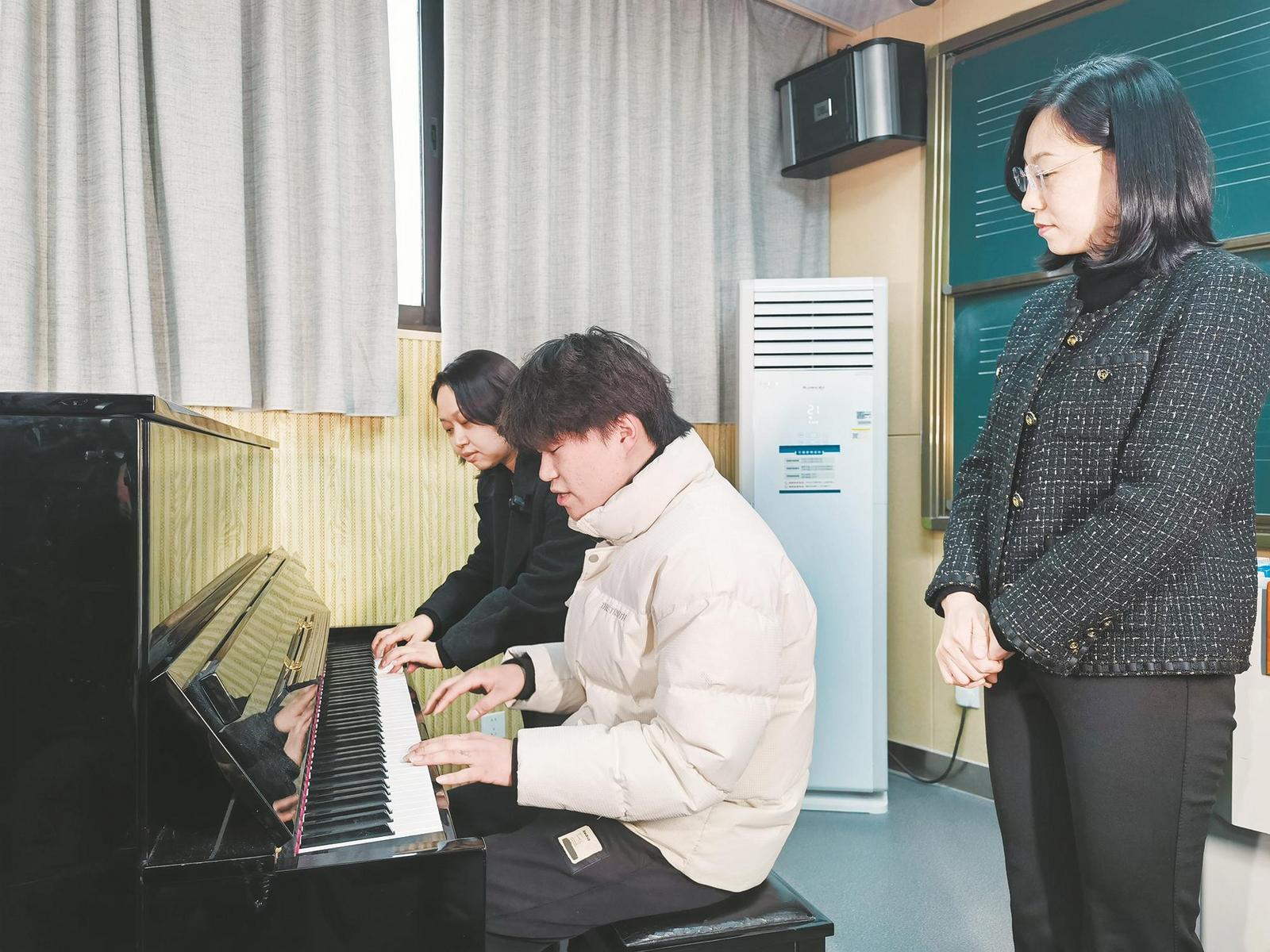 绍兴文理学院蔡元培艺术与设计学院副院长张琦和钢琴教研室副主任王峥铮早已等候在学院月明楼的音乐教室。看到两位老师的那一刻,小柴显得有些局促和腼腆。或许是因为太过紧张和激动,试弹时小柴觉得自己弹得有些混乱。这时,张琦上前与他即兴四手联弹,王峥铮轻拍他的肩膀,帮助他稳定。在老师的引导下,柴梓栋的心逐渐平静下来,节奏也变得顺畅而平稳。