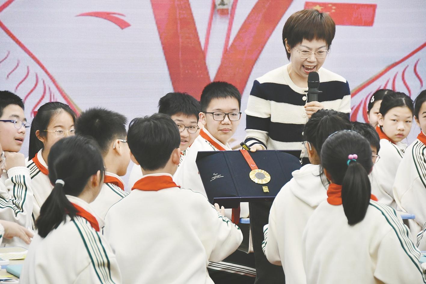 在《承胆剑千年风骨,做时代奋进少年》这堂思政课上,学生触摸蒋裕燕姐姐的金牌。(记者 王丽红 摄)