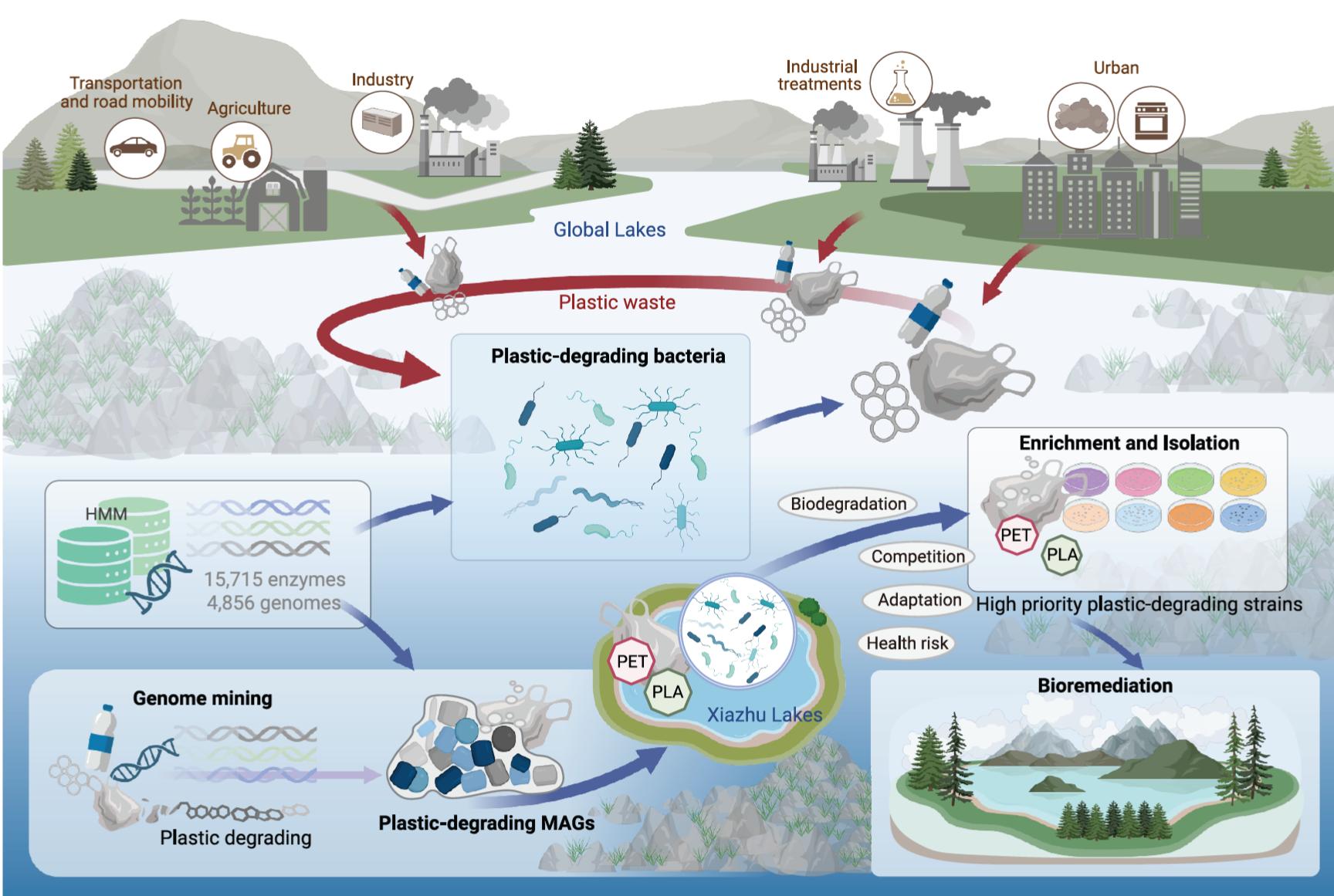近日,我校高等研究院钱海丰团队联合中国科学院生态环境研究中心朱永官院士团队,在Cell旗下综合性学术期刊《The Innovation》,发表题为“Potential plastic biodegradation in lakes worldwide”的研究论文。该研究全球宏基因组数据挖掘降解微生物,构建应用潜力评估框架,并通过培养实验验证了微生物的降解能力,为塑料污染生物修复提供新的微生物种质资源。