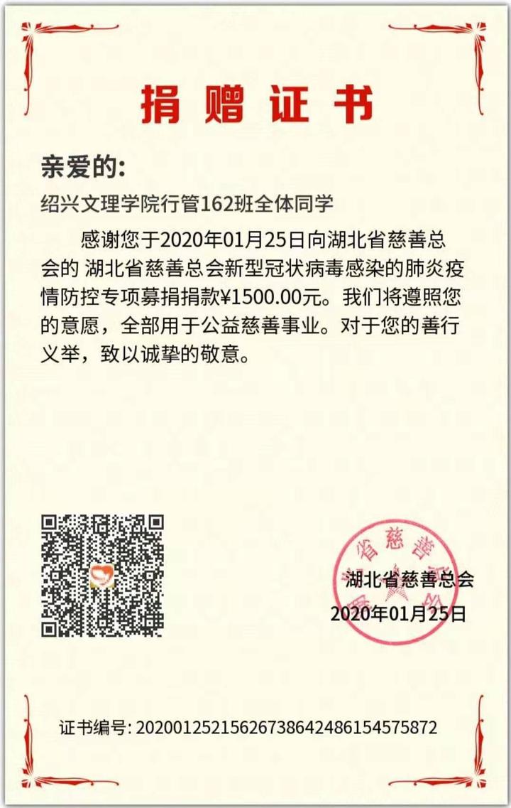 1月25日,农历正月初一,绍兴文理学院商学院公共管理系行政管理162班团支部、班委会在班级QQ群中号召全班同学,自愿缴纳“特殊班费”,收齐后统一以“绍兴文理学院行管162班全体同学”的名义,在线参与“湖北省慈善总会新型冠状病毒感染的肺炎疫情防控专项募捐”。
