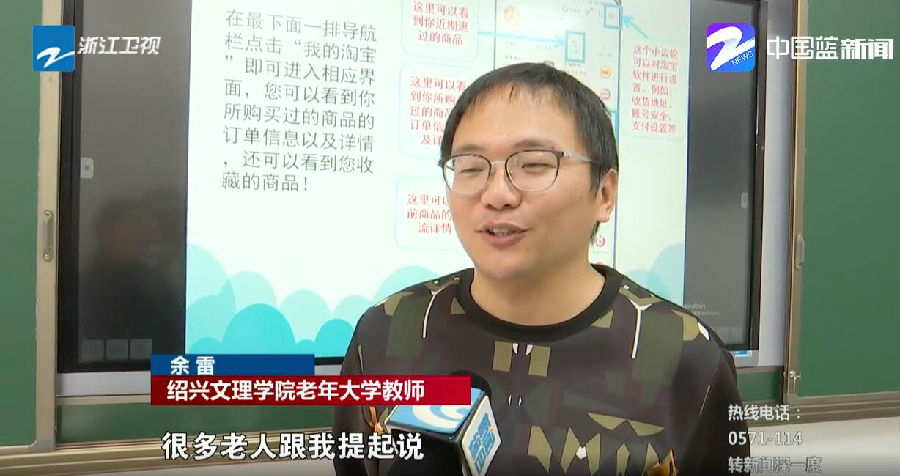 绍兴文理学院老年大学教师余雷:很多老人跟我提起说,马上“双11”来了,铺天盖地的广告都很多,他们也想学习着淘宝怎么用,支付宝怎么用,所以我们把这个课从后面提到前面来开设了。