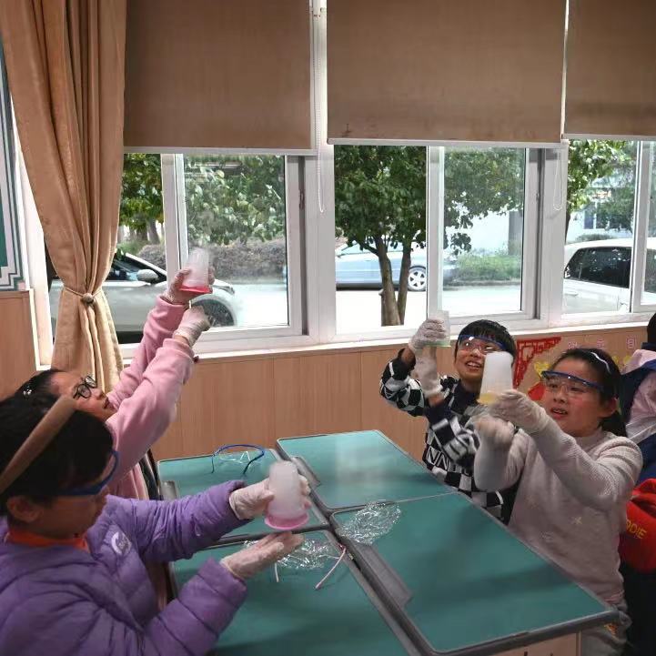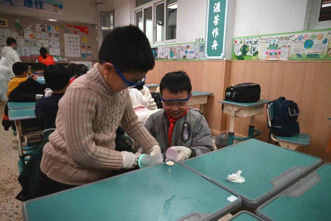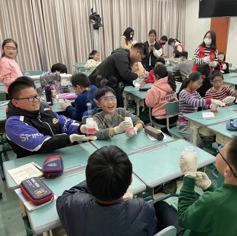 在区科协的积极推动下,绍兴文理学院化学与新材料科普基地依托其特色资源,设计互动性强、参与性强的系列科普实验,选拔“科普大使”进校园,大学生科普志愿者大手牵小手,让“双减”后的孩子们在寓教于乐中提高自身科学素质,助力科技强国梦。
